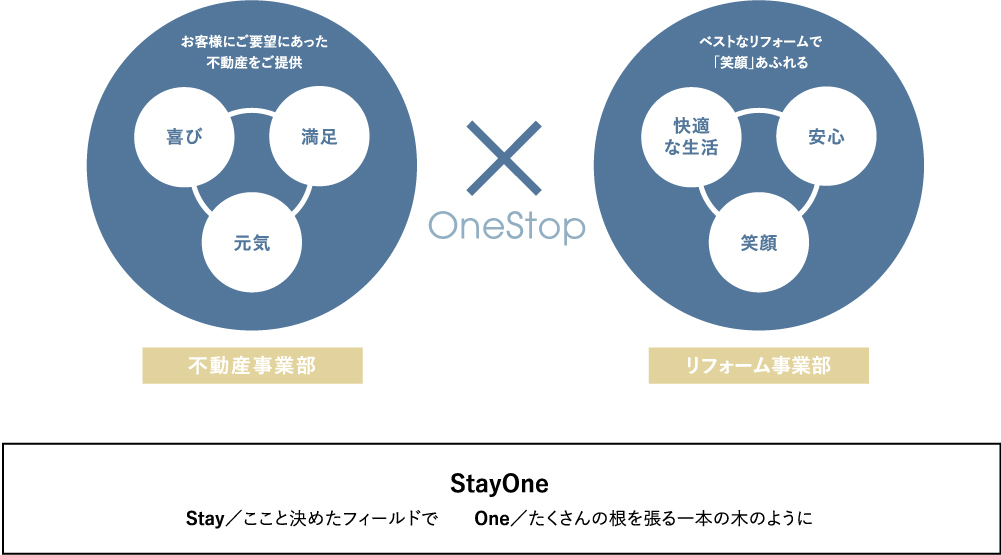 StayOne は、関西を中心に不動産売買・新築分譲・賃貸管理といった、あらゆる不動産取引から リフォームまでの住まいに関する事業を社内ワンストップでおこなっております。